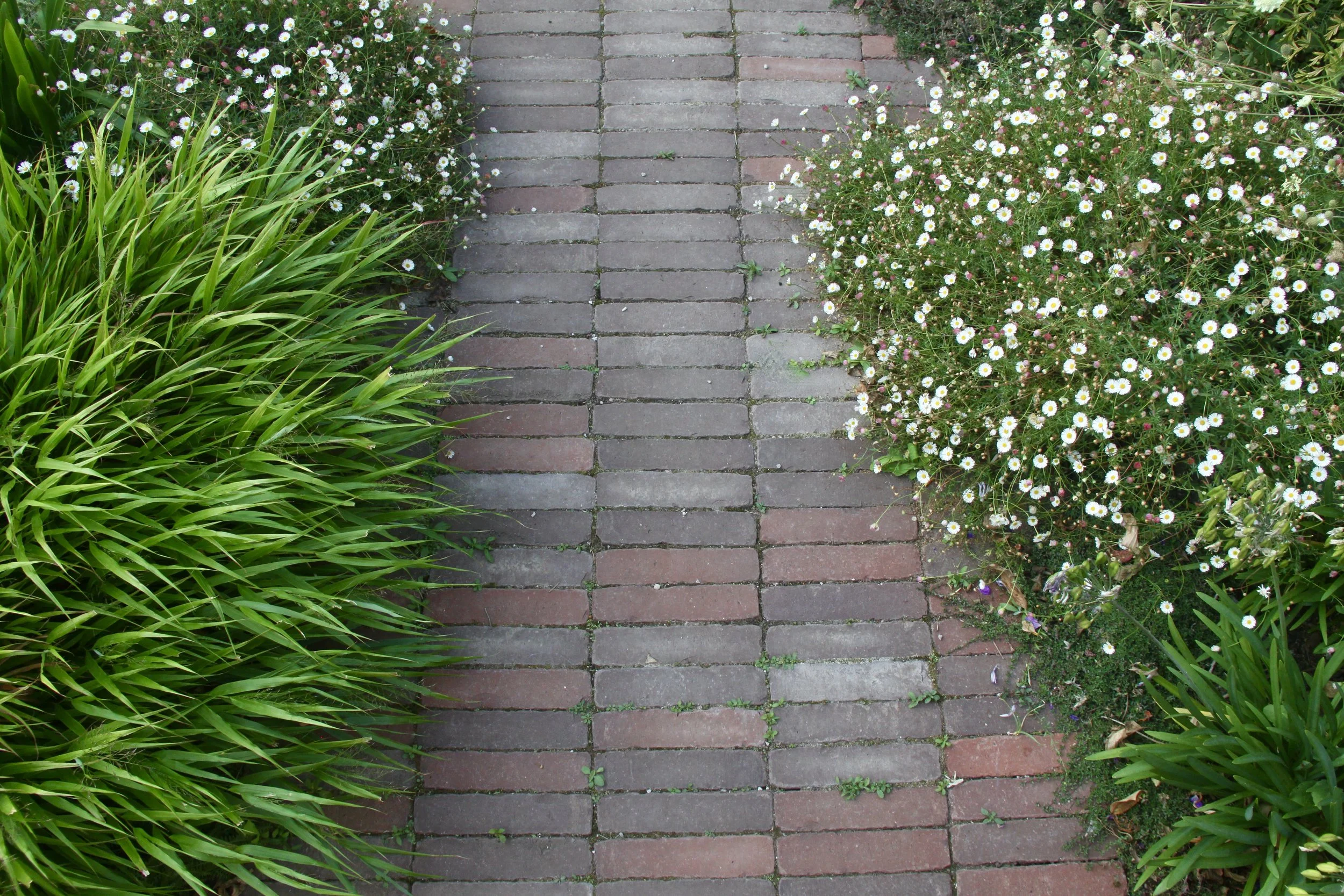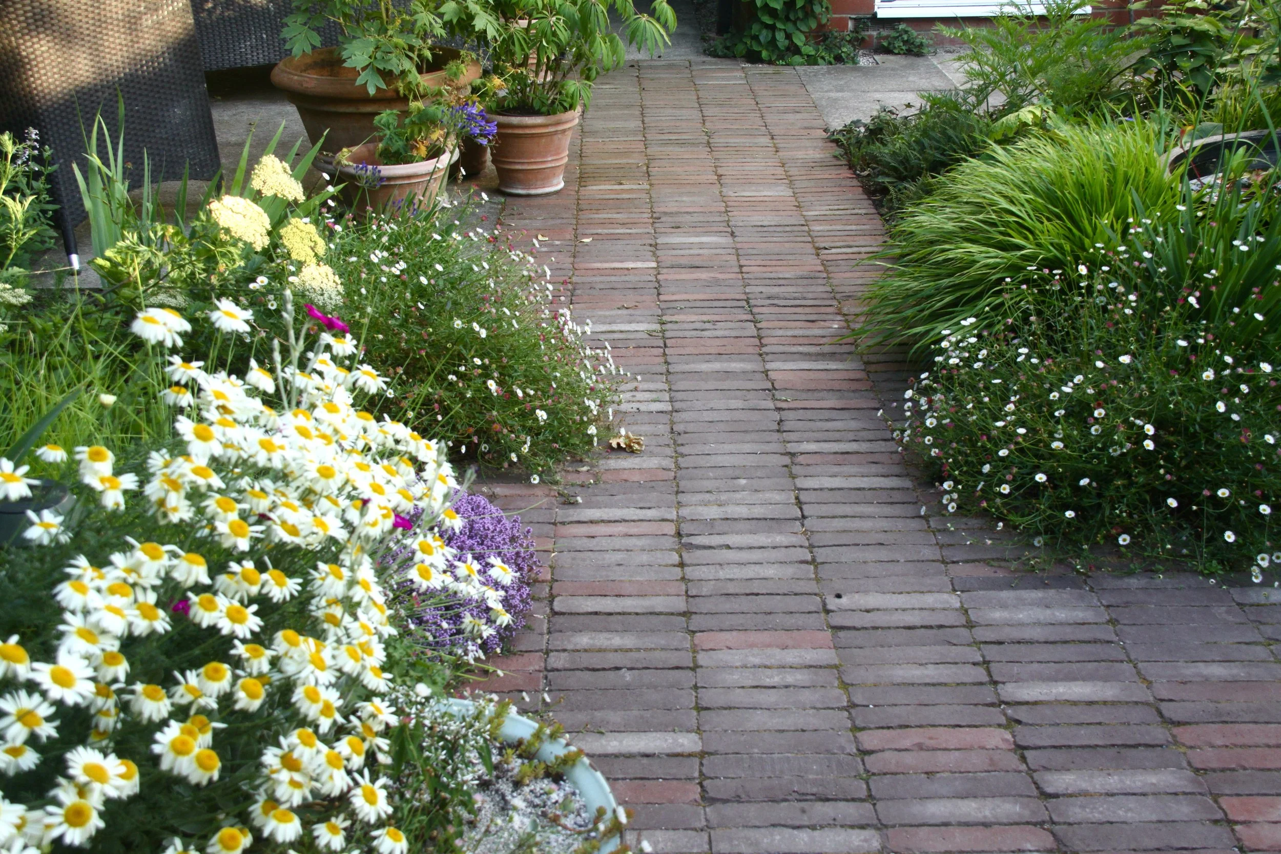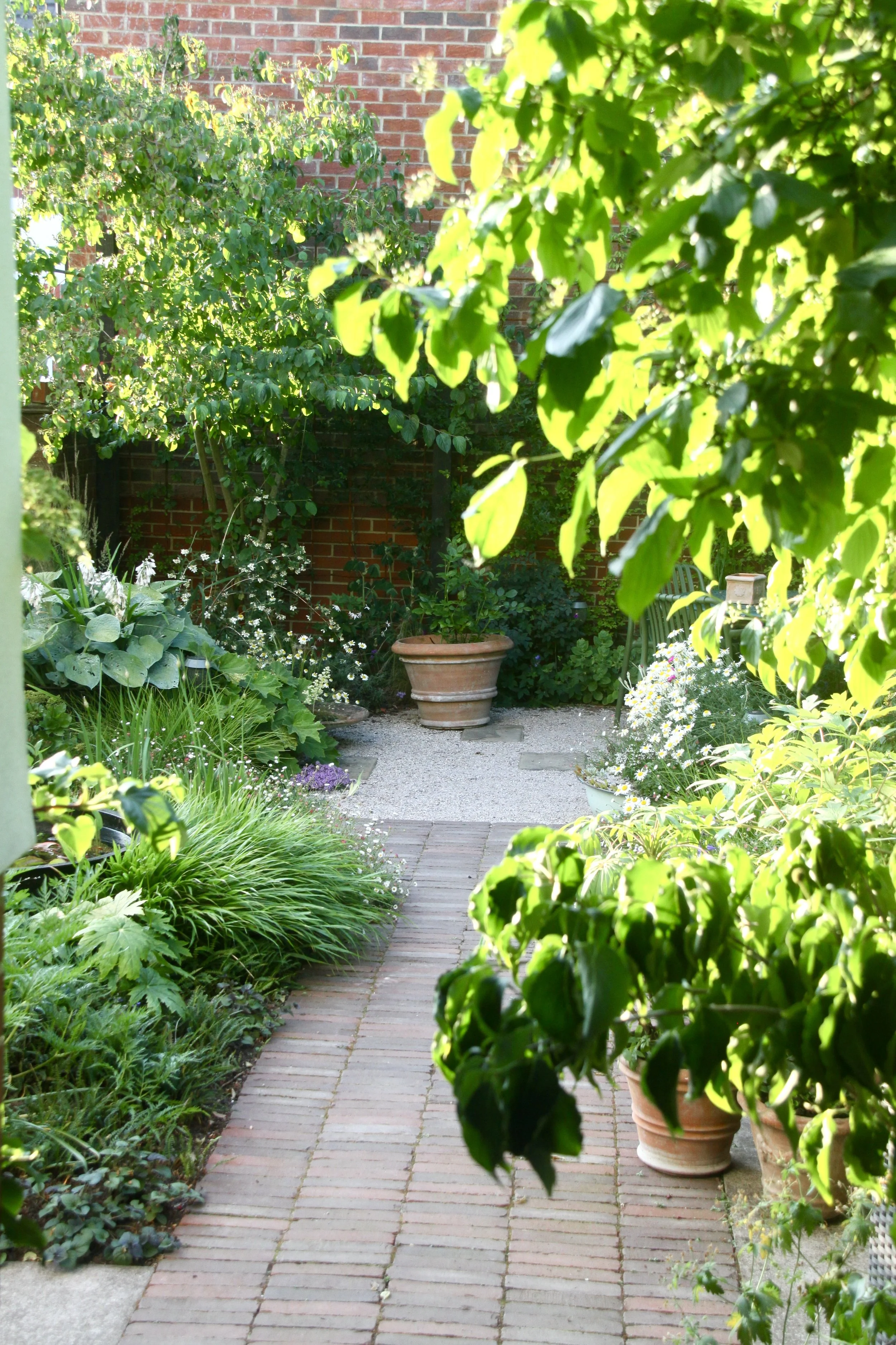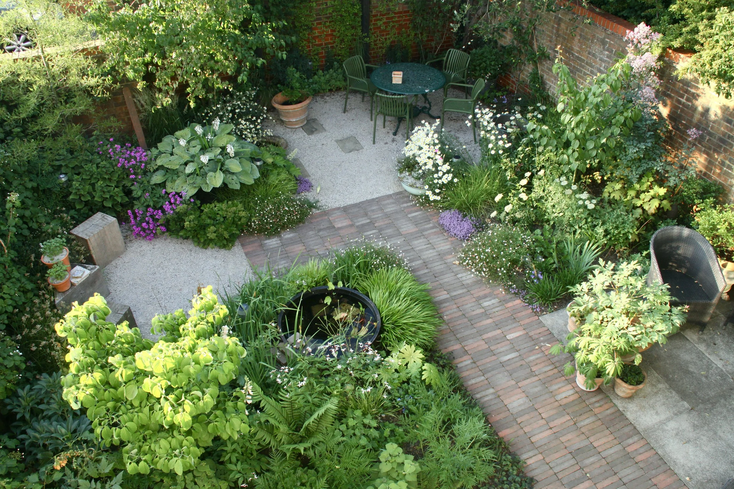 Salvaged paving slabs, reclaimed clay pavers and crushed waste concrete as gravel combine to form the hard landscape palette, harmonious in tone to the surrounding properties.