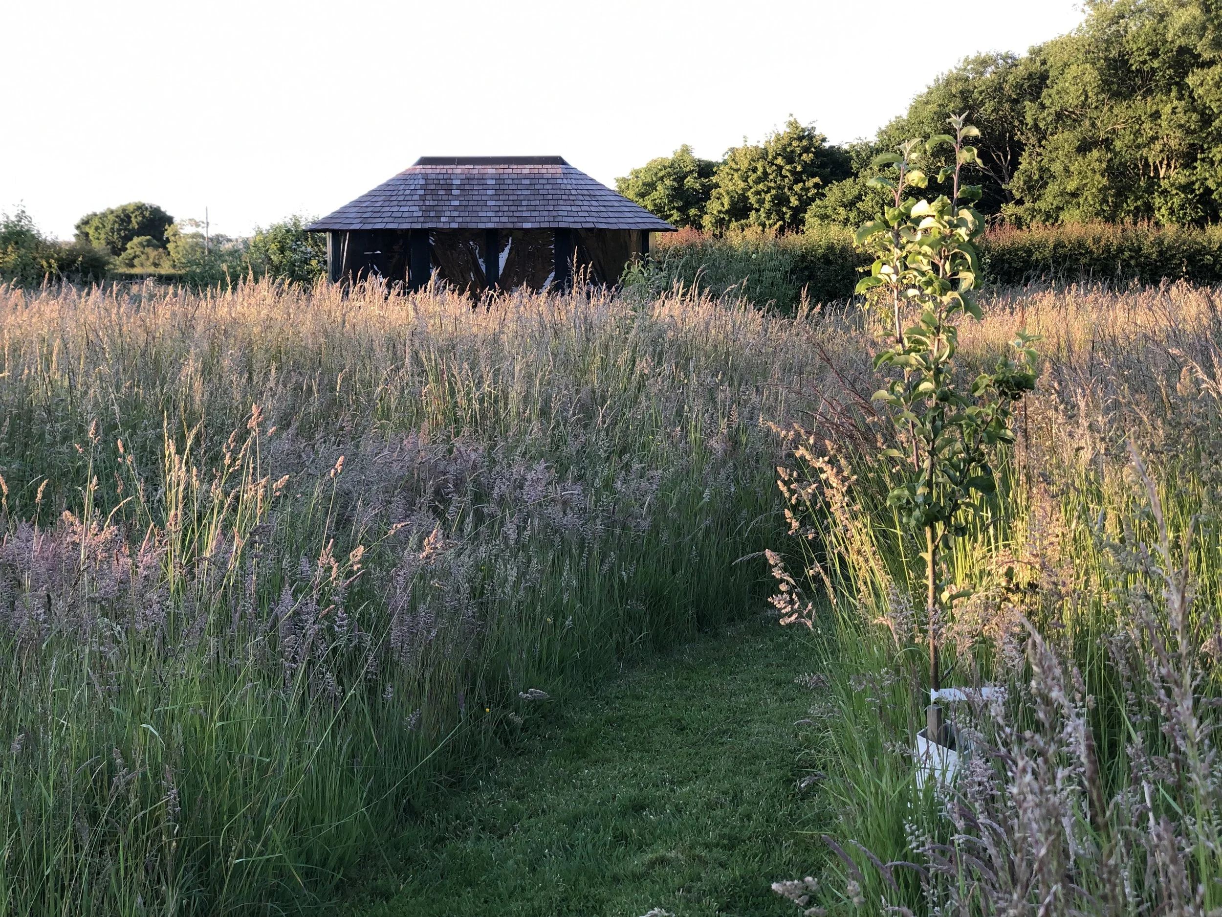 The meadow will evolve gradually, with fertile green sand soil supporting species such as buttercup, vetch, sorrel, yarrow and Geranium pratense ‘Mrs Kendall Clark’. The young orchard will provide fruit for the family in its later years, while softening views of the garden room and framing views to the wider countryside.